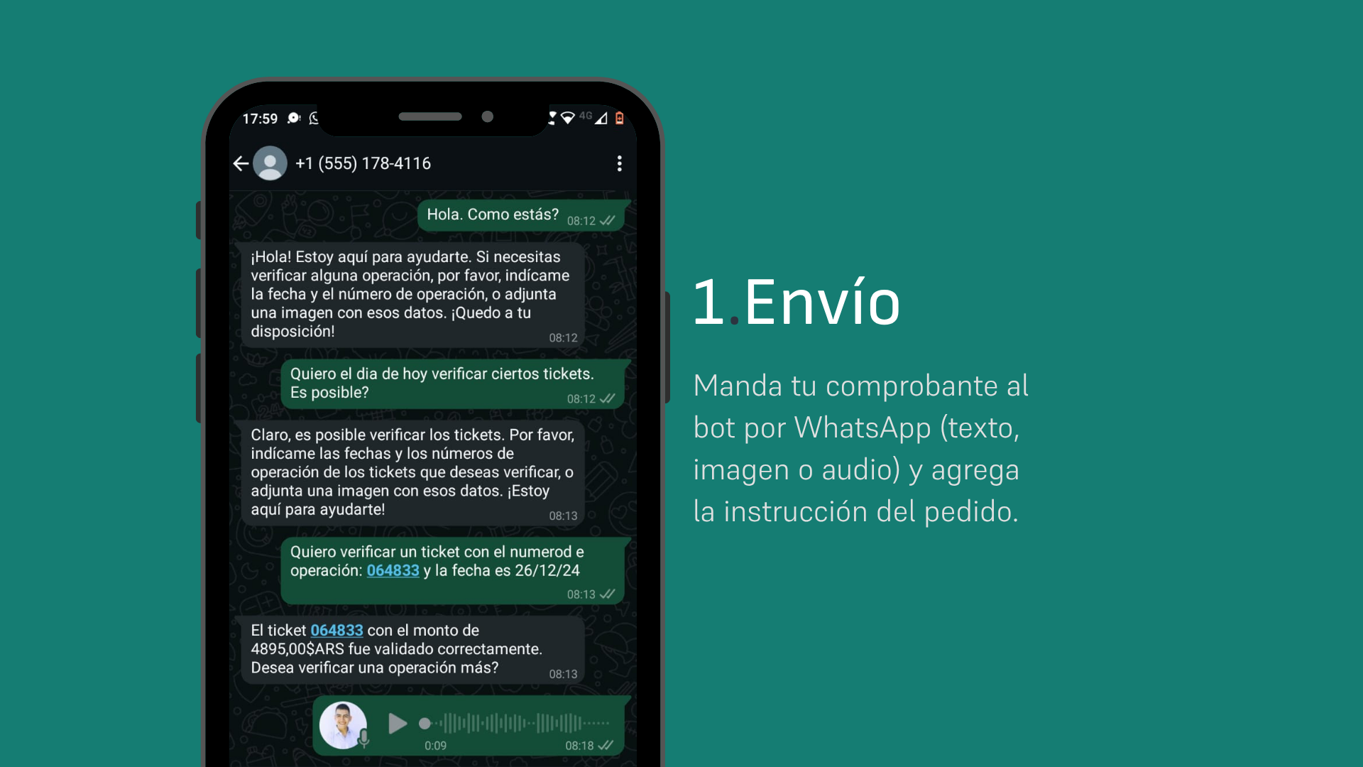 Envías el Comprobante: Lo haces por WhatsApp. Puedes enviarlo como Imagen (ticket/factura), Texto o Audio.