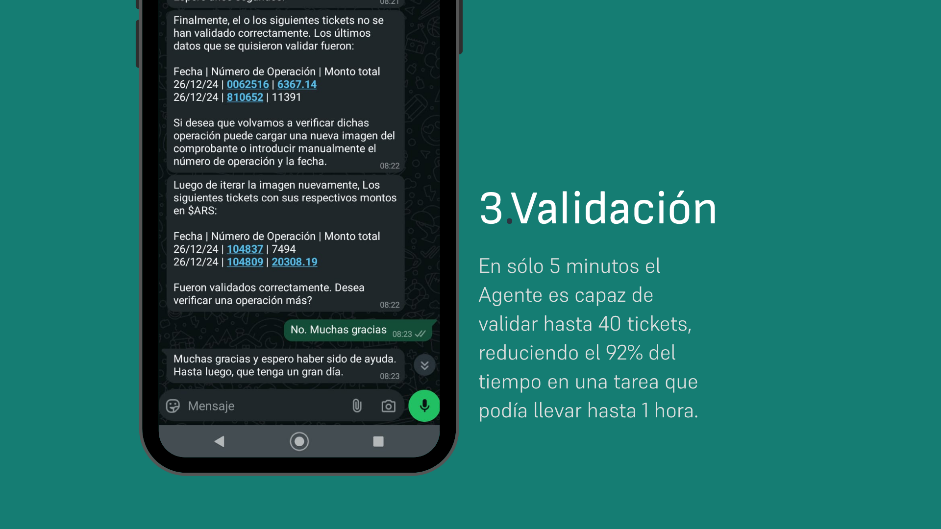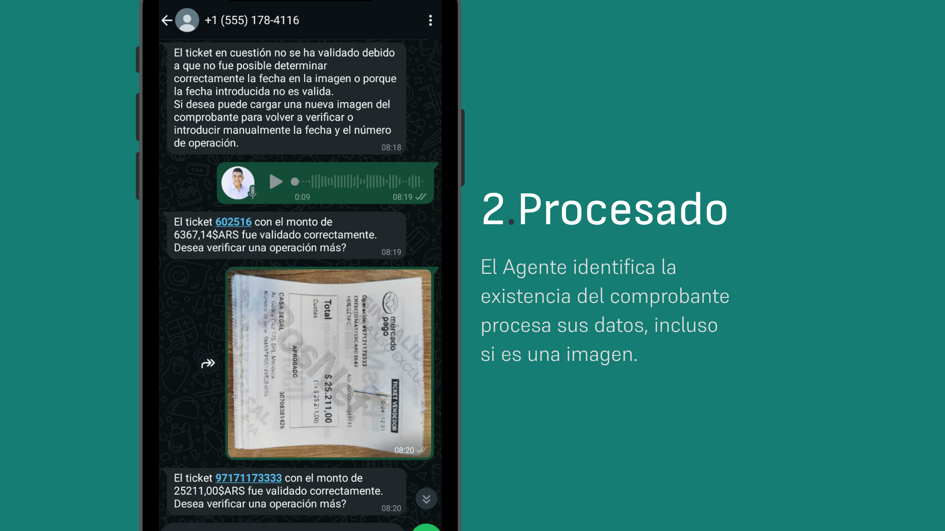 Resultado y Control: El Agente consulta tu BBDD para validar la existencia del comprobante.